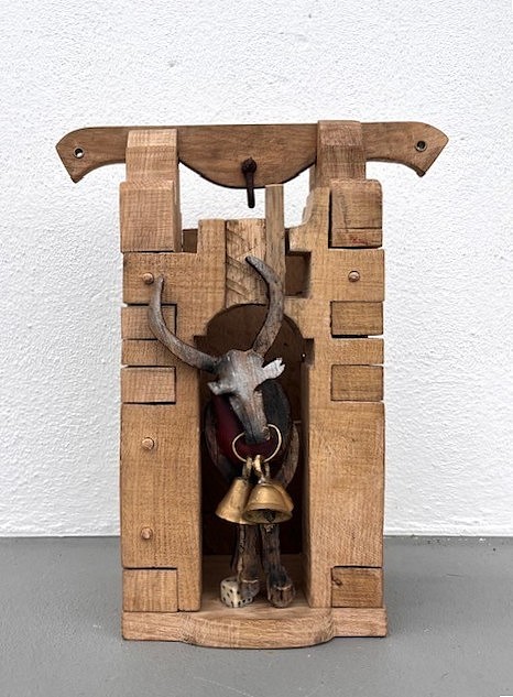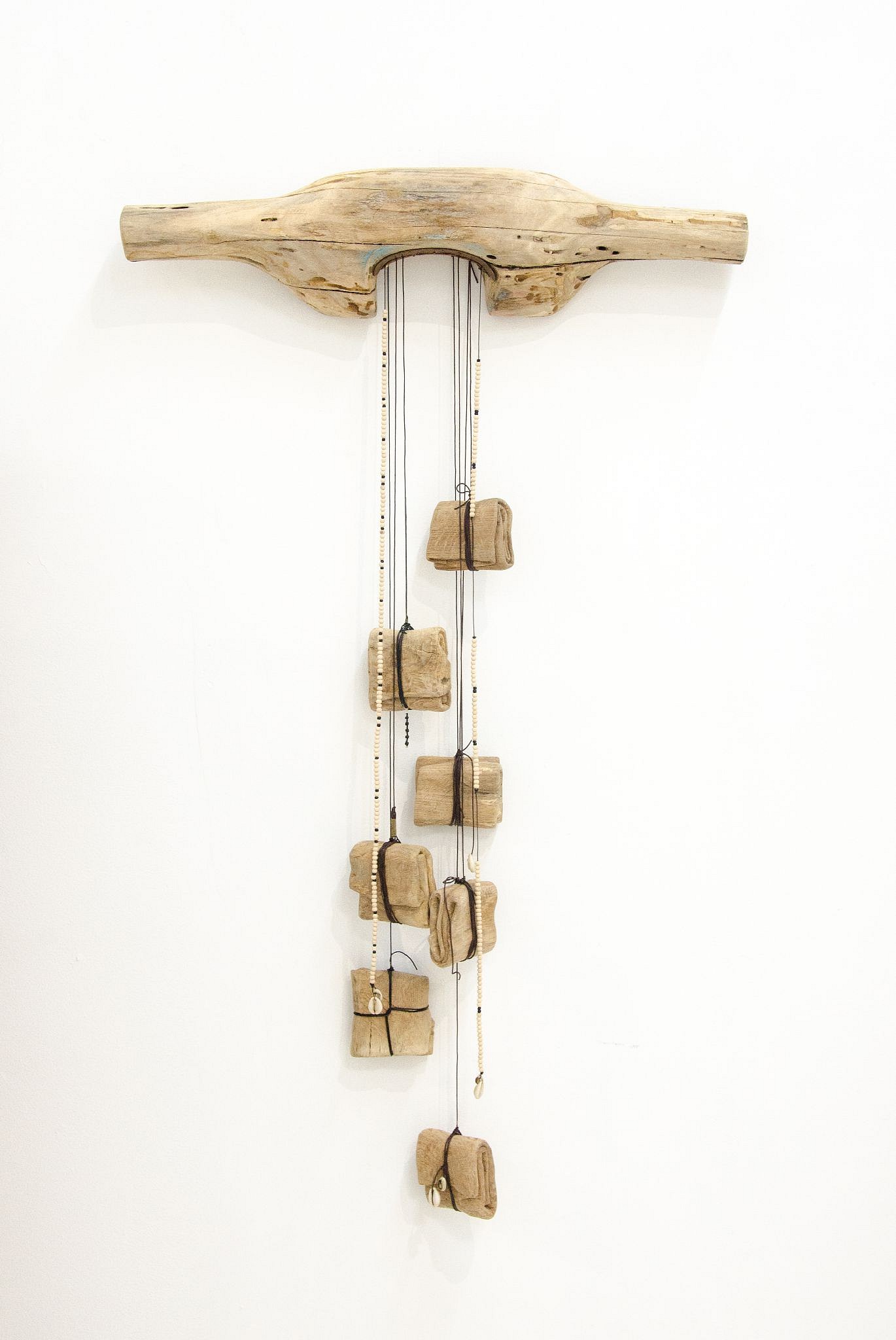 black oak, waxed thread, copper, beads and shells, 123 x 70 x 10 cm (48 3/8 x 27 1/2 x 3 7/8 in.)
